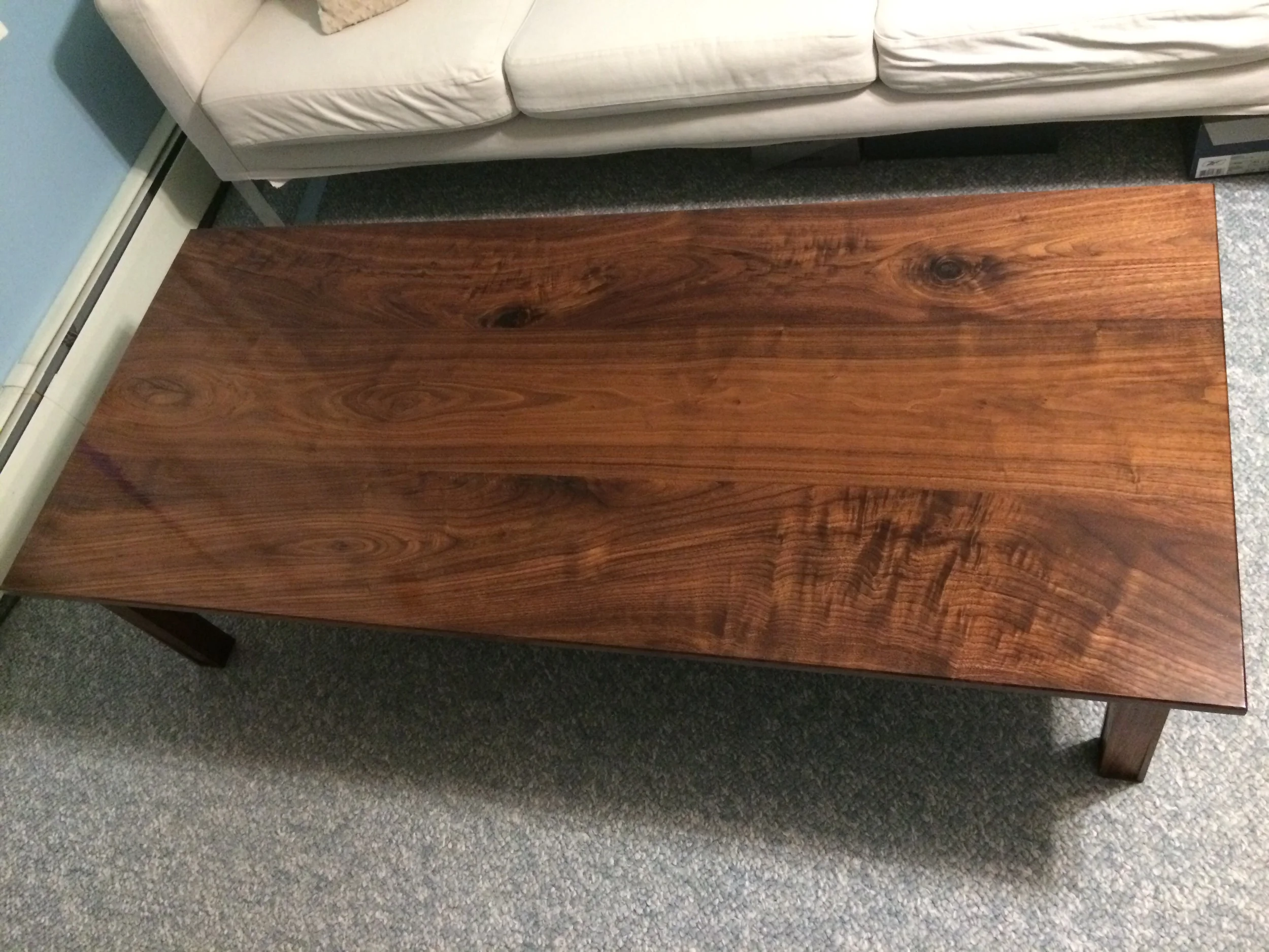 The snow is finally melting away as temperatures rise and winter makes her exit. With that, applying finish to projects is in full swing. Progress on the sapele / walnut coffee table was slowed due to a freezing cold February. As you can see, that barrier has been overcome and the coffee table has been completed. The base was coated with natural danish oil and then a thin coat of de-waxed shellac. The top was a little bit more involved. I attempted to use Crystalac to fill the walnut grain but was not completely happy with the product. After sanding it away, I coated the walnut with danish oil. Once the first coat set, I applied a second generous coating to the top and, before it could dry, used it to wet sand with 320 grit sandpaper.